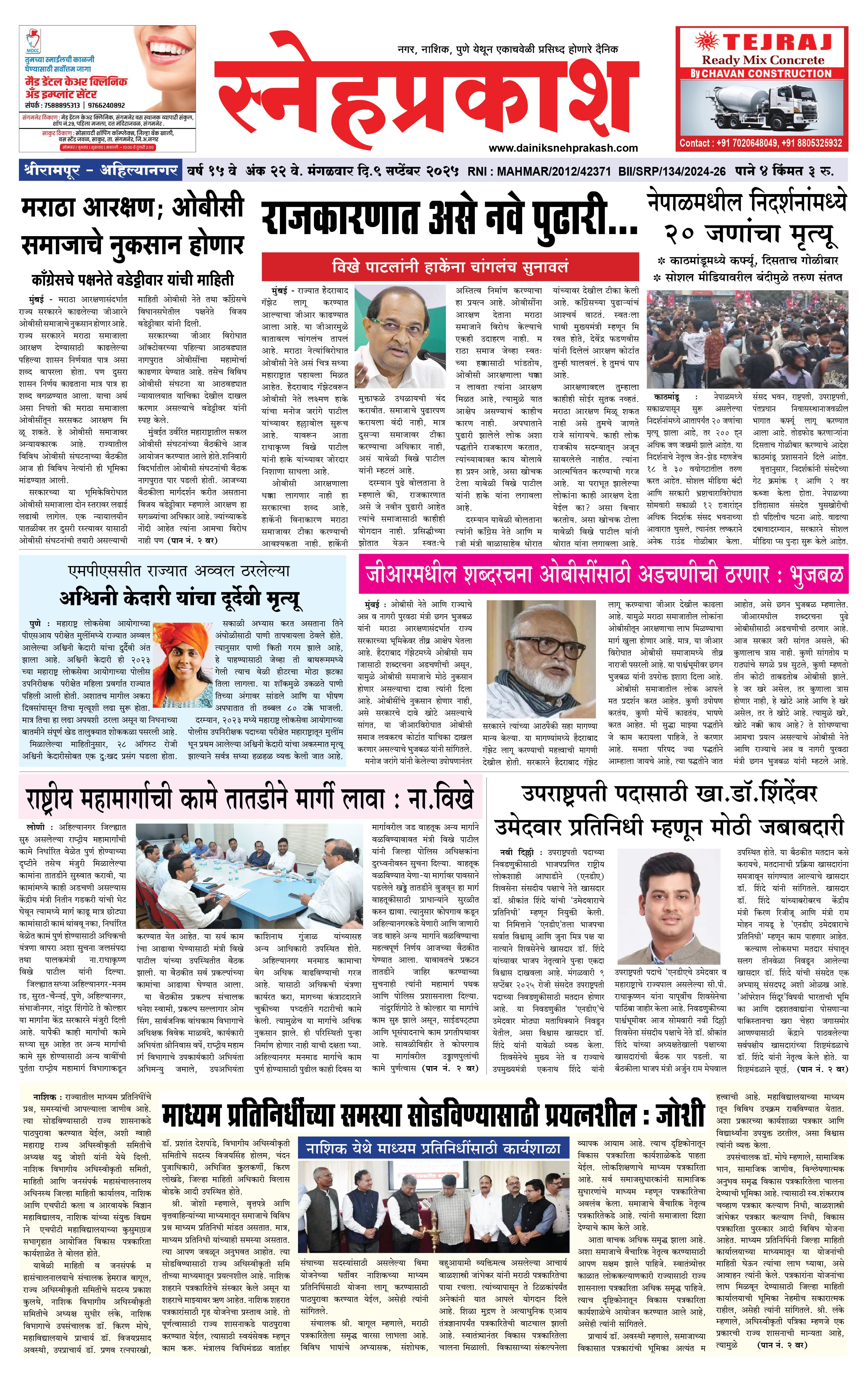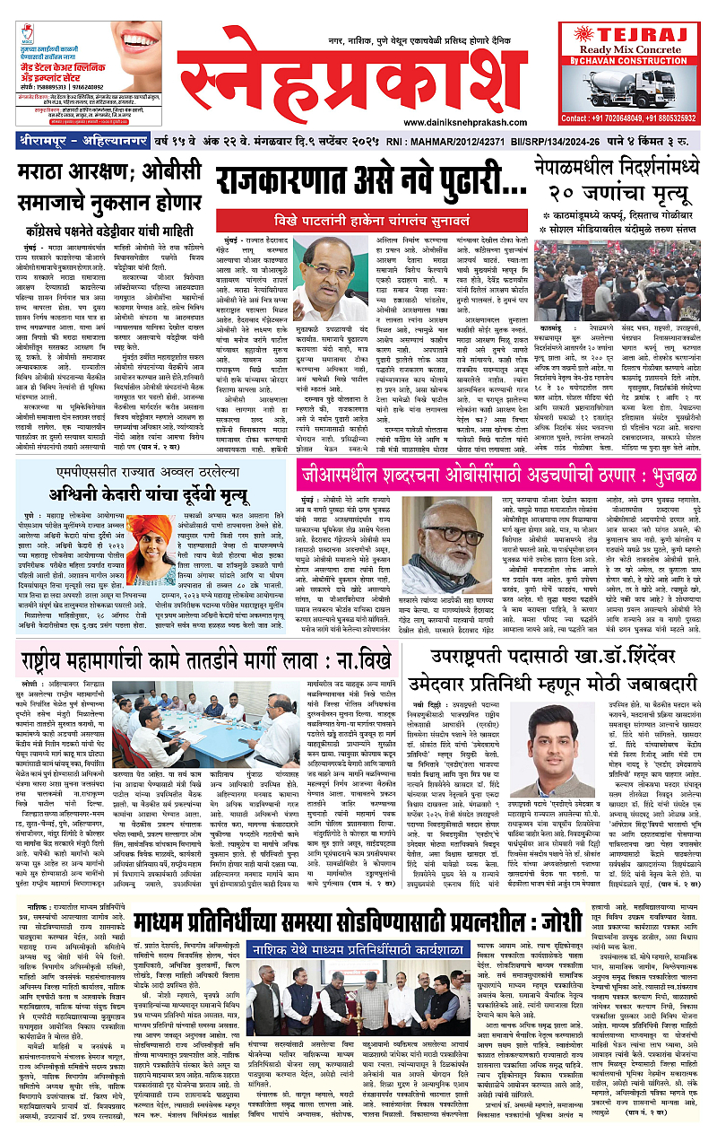 Daily Snehprakash (Marathi) September 09, 2025 Ahilyanagar-Pune-Nashik-shrirampur maharashtra 1 2 3 4 Page 1Page 2Page 3Page 4 × Daily Snehprakash (Marathi) 1-4 colour1-4 colour21-4 colour31-4 colour4 << First << 1 >> Last >> Page no 1Page no 2Page no 3Page no 4