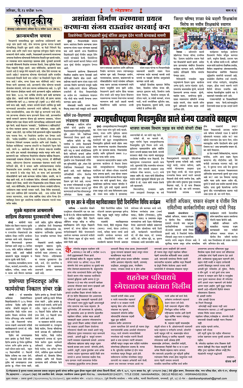 Daily Snehprakash (Marathi) Page: 2 September 13, 2025 Ahilyanagar-Pune-Nashik-shrirampur maharashtra 1 2 3 4 Page 1Page 2Page 3Page 4 × Daily Snehprakash (Marathi) 1-4 colour1-4 colour21-4 colour31-4 colour4 << First << 2 >> Last >> Page no 1Page no 2Page no 3Page no 4