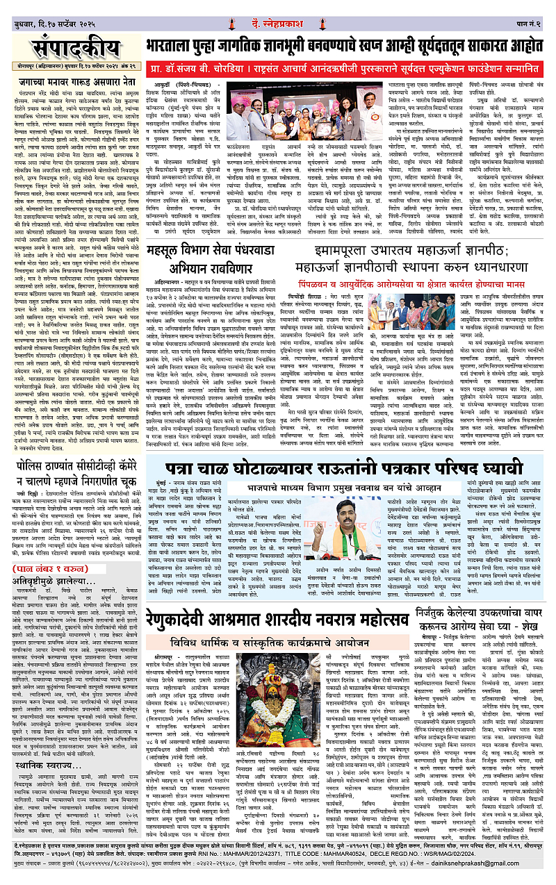 Daily Snehprakash (Marathi) Page: 2 September 17, 2025 Ahilyanagar-Pune-Nashik-shrirampur maharashtra 1 2 3 4 Page 1Page 2Page 3Page 4 × Daily Snehprakash (Marathi) 1-4 colour1-4 colour21-4 colour31-4 colour4 << First << 2 >> Last >> Page no 1Page no 2Page no 3Page no 4
