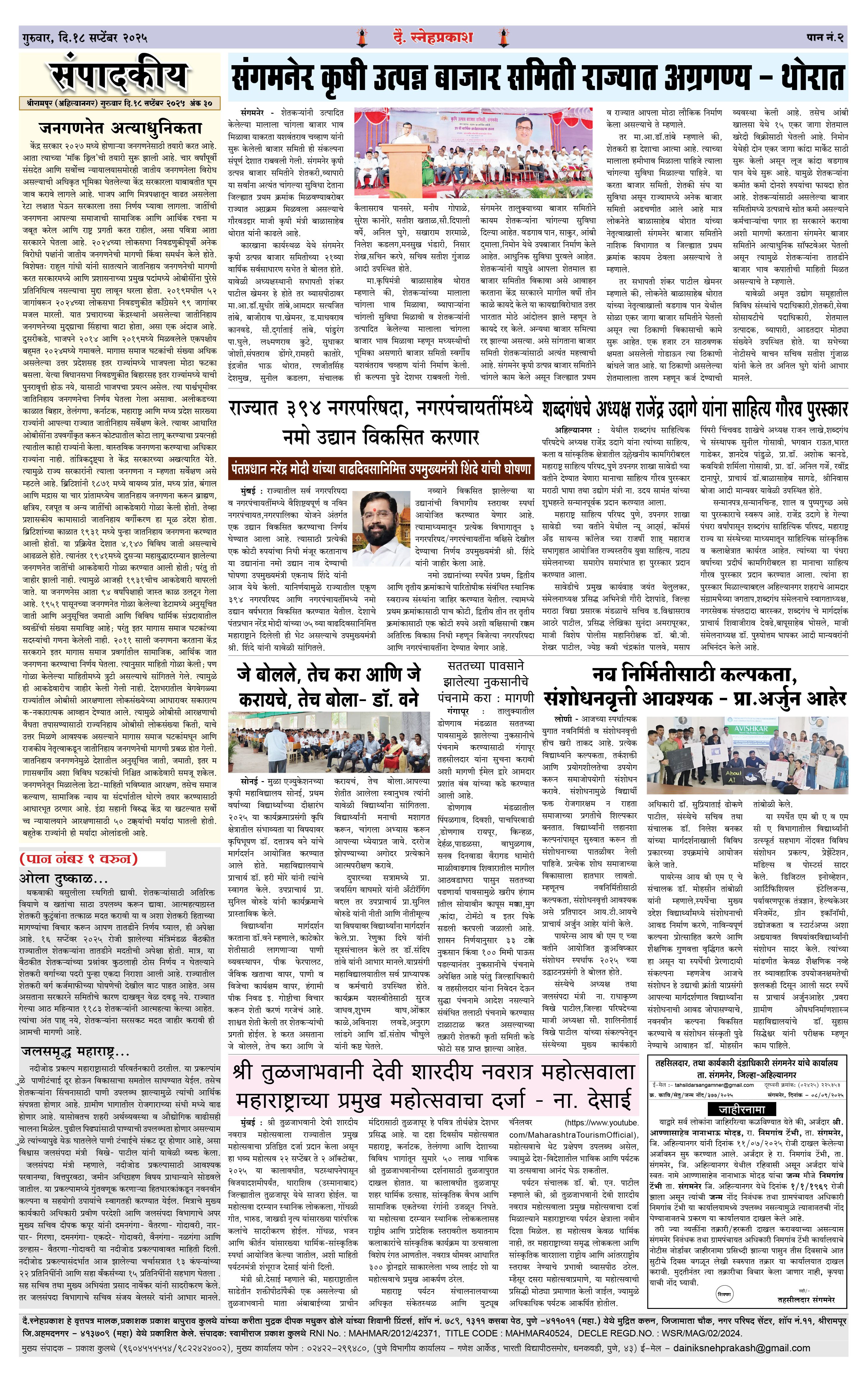 Daily Snehprakash (Marathi) Page: 2 September 18, 2025 Ahilyanagar-Pune-Nashik-shrirampur maharashtra 1 2 3 4 Page 1Page 2Page 3Page 4 × Daily Snehprakash (Marathi) 1-41-421-431-44 << First << 2 >> Last >> Page no 1Page no 2Page no 3Page no 4
