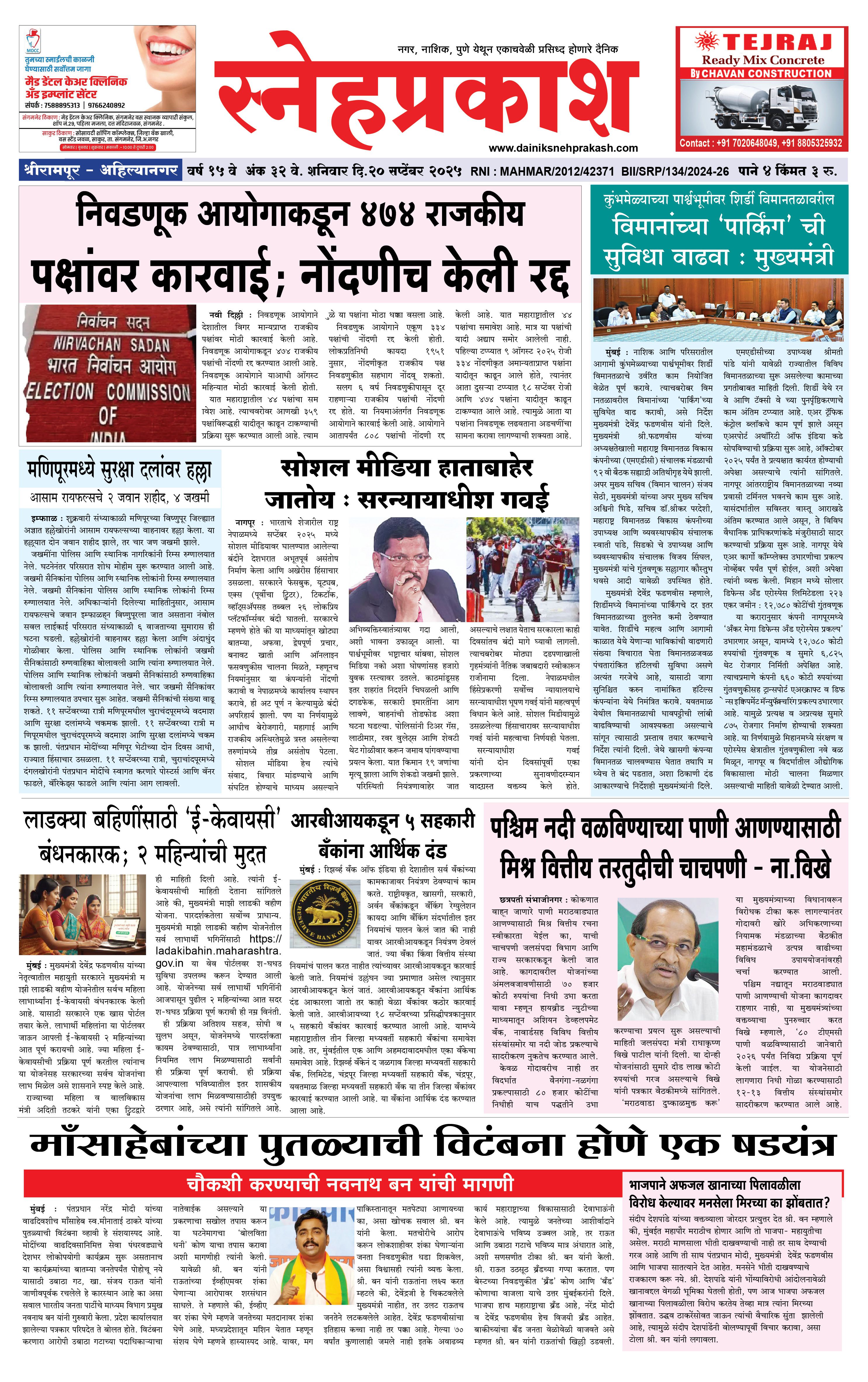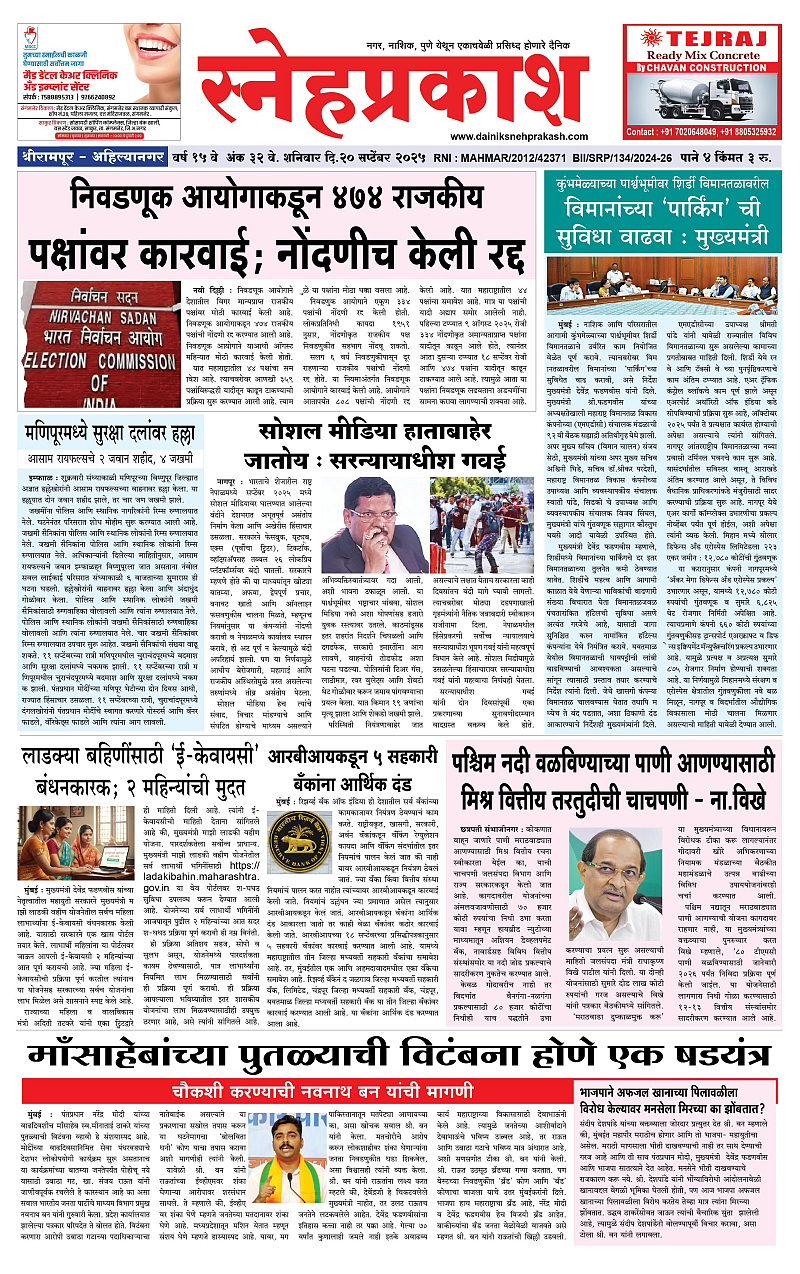 Daily Snehprakash (Marathi) September 20, 2025 Ahilyanagar-Pune-Nashik-shrirampur maharashtra 1 2 3 4 Page 1Page 2Page 3Page 4 × Daily Snehprakash (Marathi) 1-4 colour1-4 colour21-4 colour31-4 colour4 << First << 1 >> Last >> Page no 1Page no 2Page no 3Page no 4