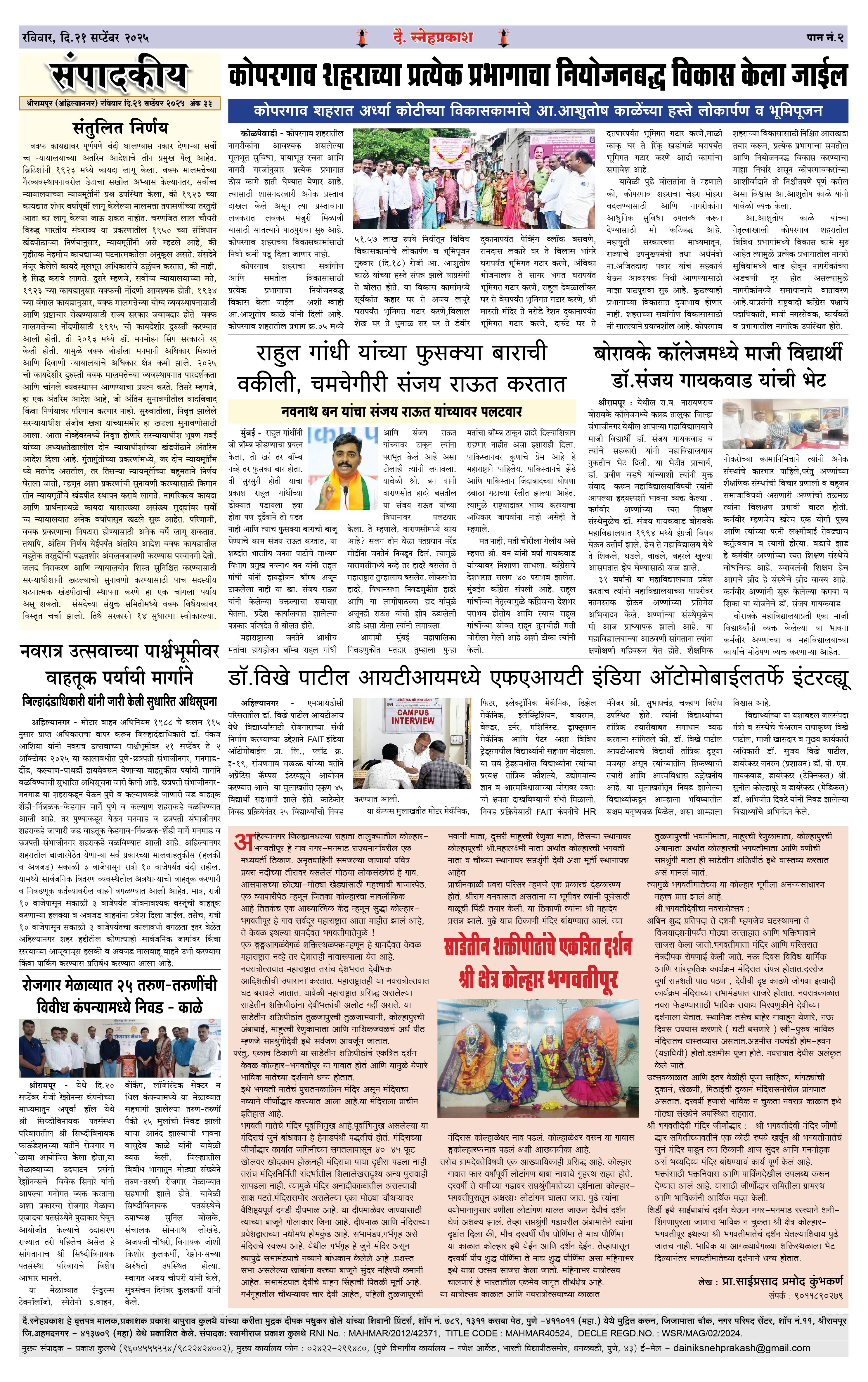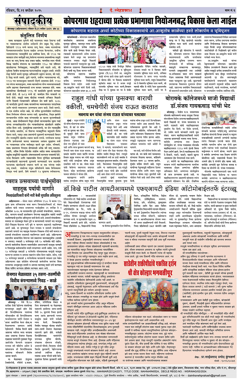 Daily Snehprakash (Marathi) Page: 2 September 21, 2025 Ahilyanagar-Pune-Nashik-shrirampur maharashtra 1 2 3 4 Page 1Page 2Page 3Page 4 × Daily Snehprakash (Marathi) 1-4 colour1-4 colour21-4 colour31-4 colour4 << First << 2 >> Last >> Page no 1Page no 2Page no 3Page no 4
