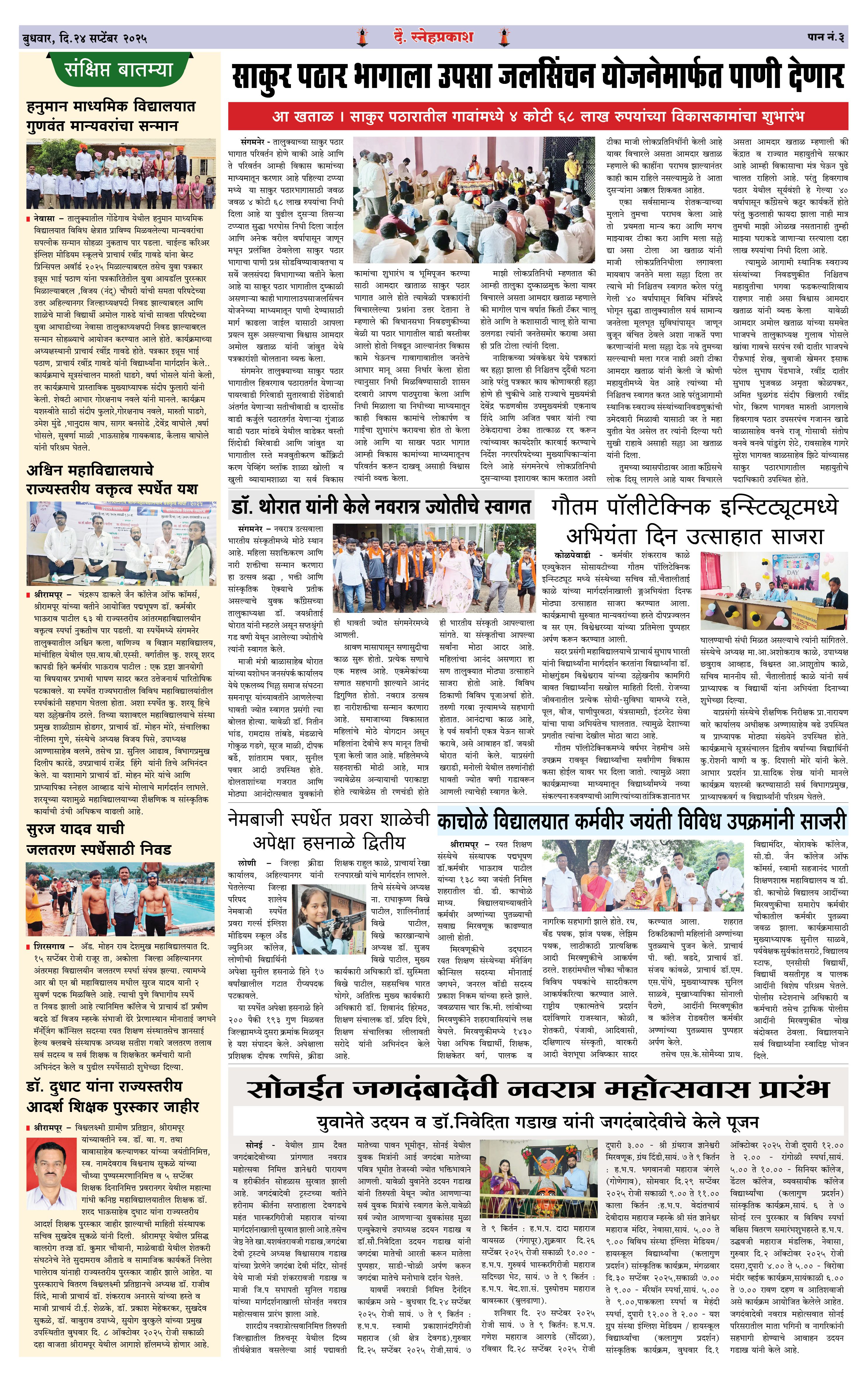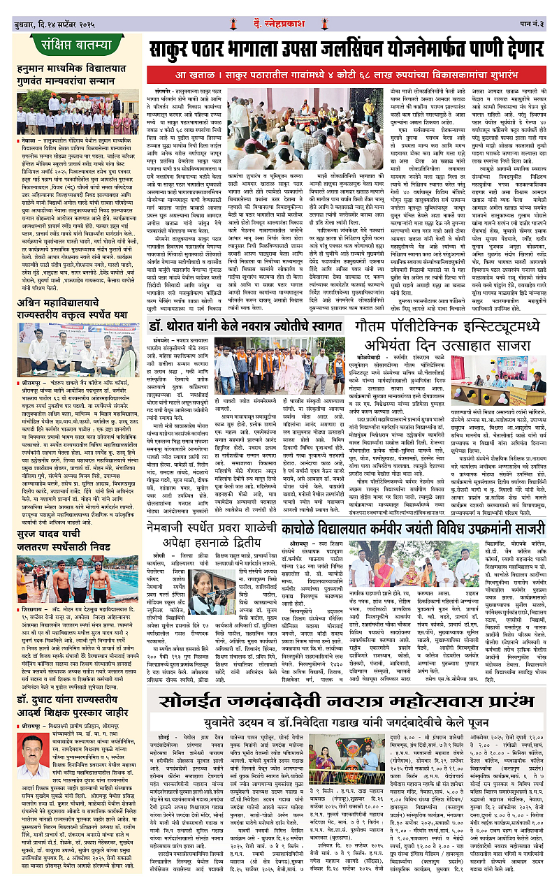 Daily Snehprakash (Marathi) Page: 3 September 24, 2025 Ahilyanagar-Pune-Nashik-shrirampur maharashtra 1 2 3 4 Page 1Page 2Page 3Page 4 × Daily Snehprakash (Marathi) 1-41-421-431-44 << First << 3 >> Last >> Page no 1Page no 2Page no 3Page no 4