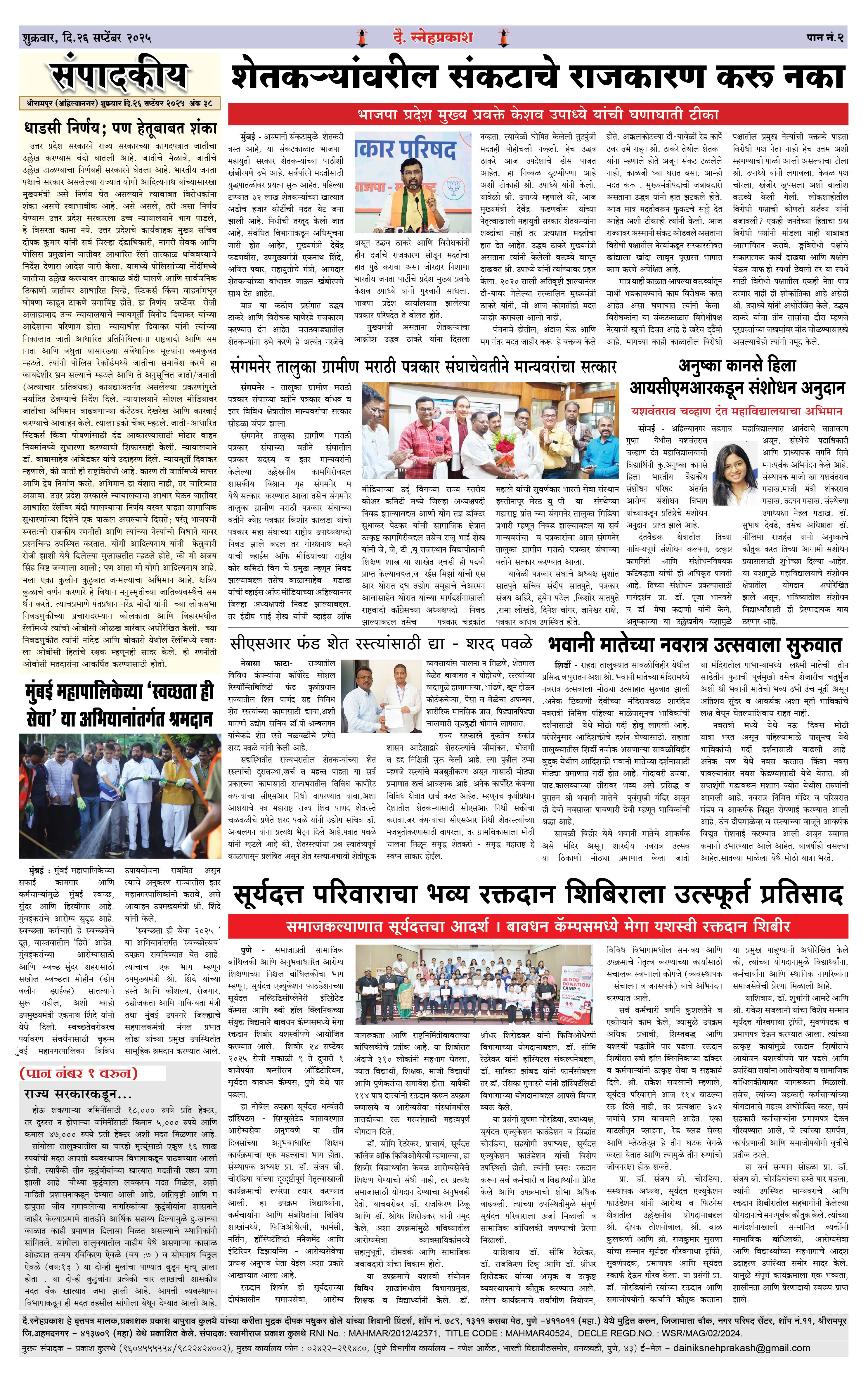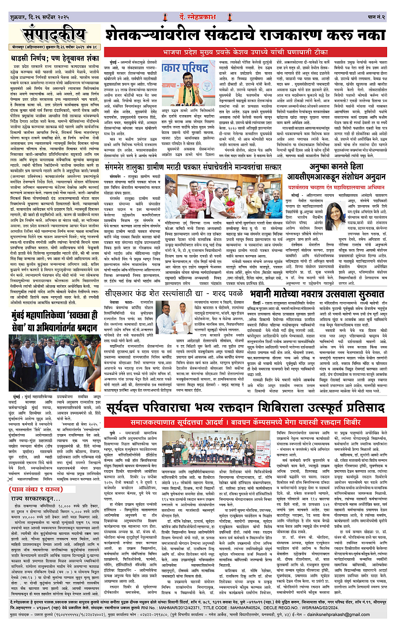 Daily Snehprakash (Marathi) Page: 2 September 26, 2025 Ahilyanagar-Pune-Nashik-shrirampur maharashtra 1 2 3 4 Page 1Page 2Page 3Page 4 × Daily Snehprakash (Marathi) 1-41-421-431-44 << First << 2 >> Last >> Page no 1Page no 2Page no 3Page no 4