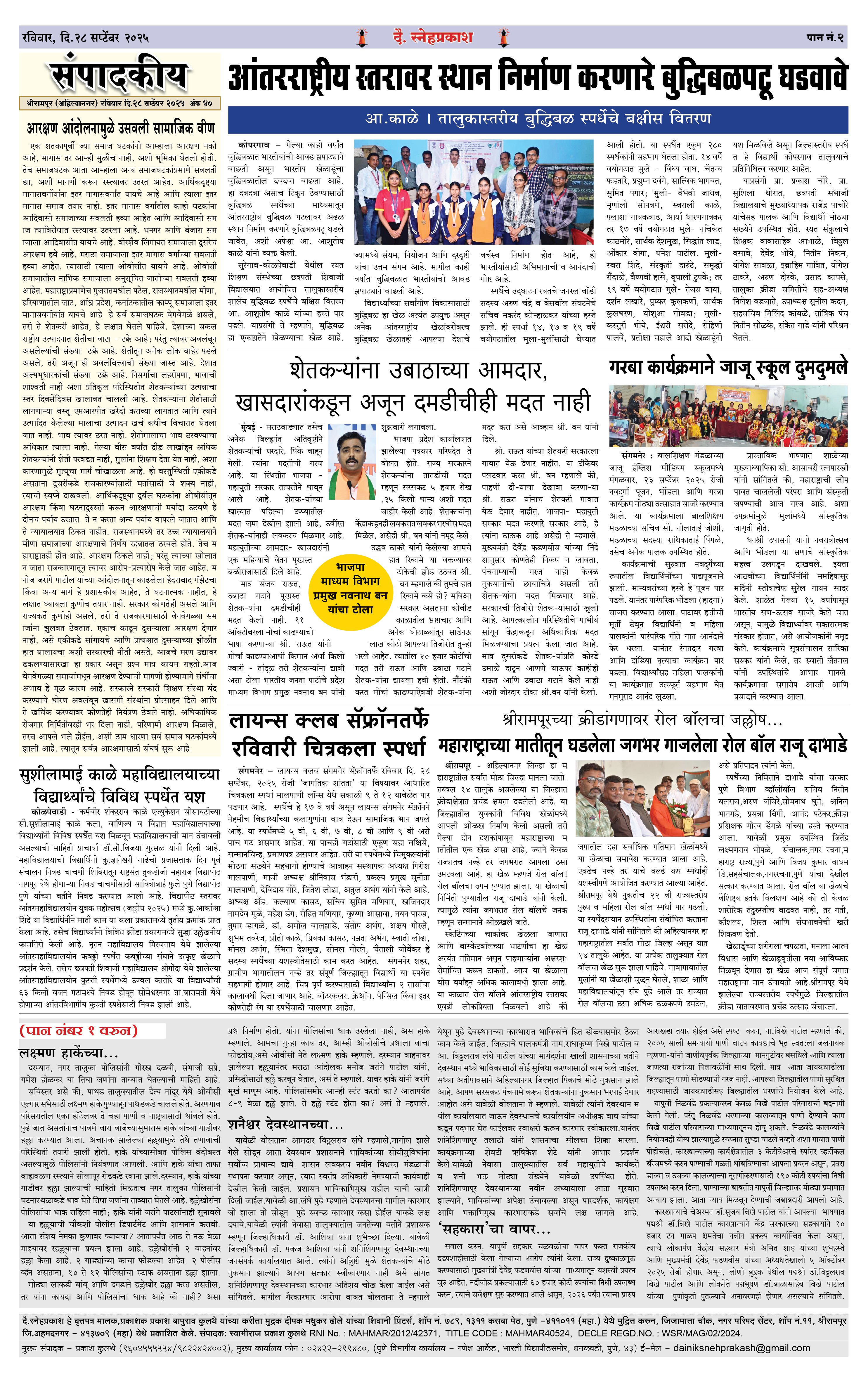 Daily Snehprakash (Marathi) Page: 2 September 28, 2025 Ahilyanagar-Pune-Nashik-shrirampur maharashtra 1 2 3 4 Page 1Page 2Page 3Page 4 × Daily Snehprakash (Marathi) 1-41-421-431-44 << First << 2 >> Last >> Page no 1Page no 2Page no 3Page no 4