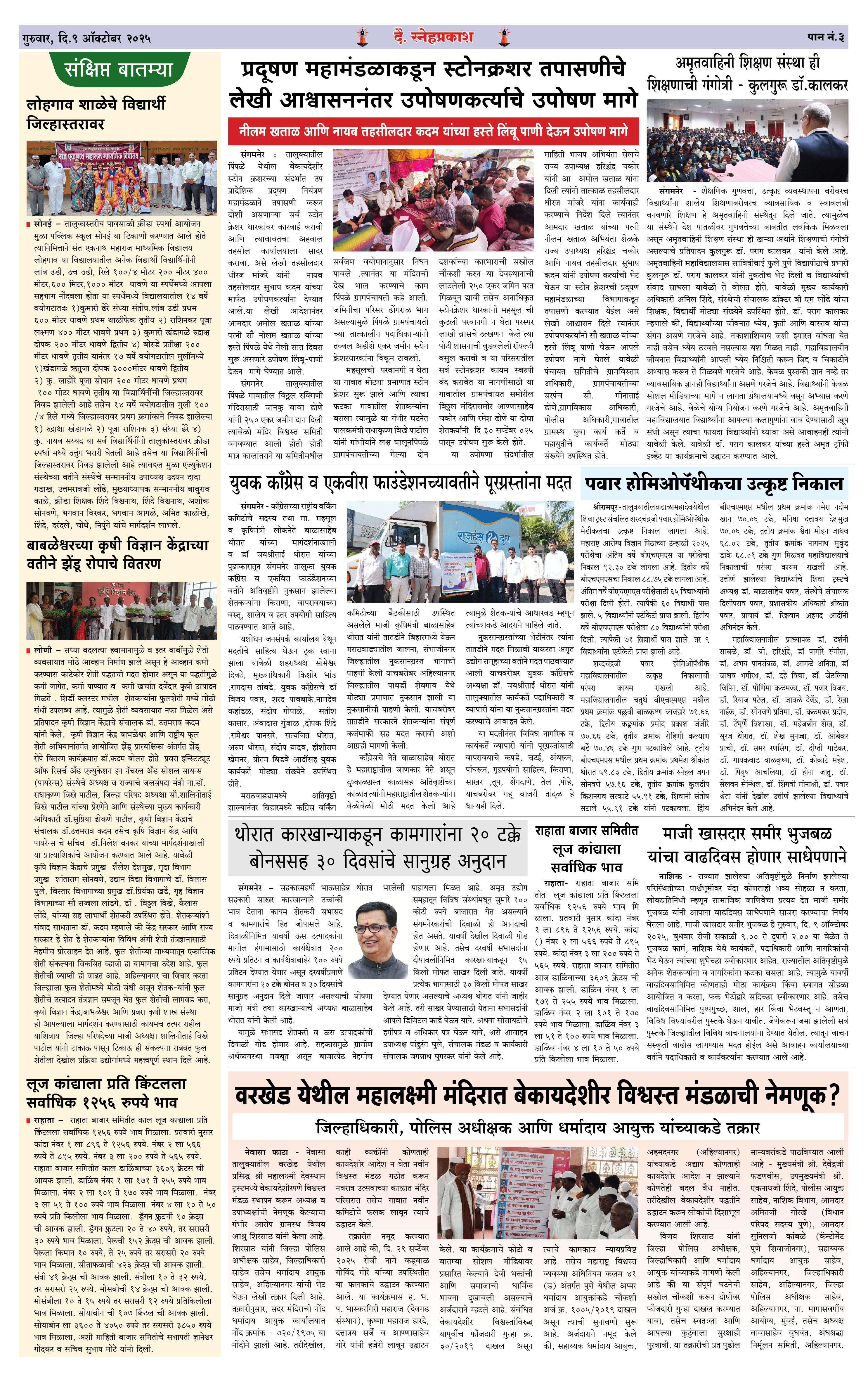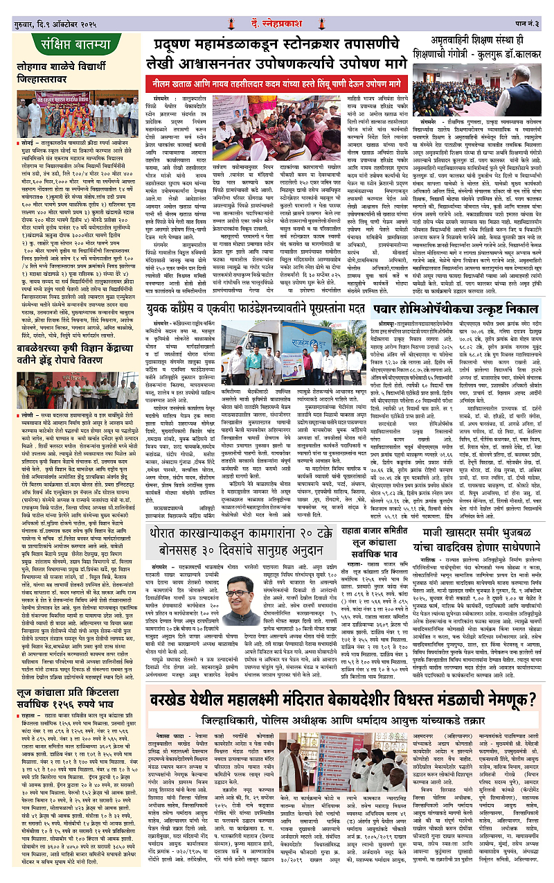 Daily Snehprakash (Marathi) Page: 3 October 09, 2025 Ahilyanagar-Pune-Nashik-shrirampur maharashtra 1 2 3 4 Page 1Page 2Page 3Page 4 × Daily Snehprakash (Marathi) 1-4 colour1-4 colour21-4 colour31-4 colour4 << First << 3 >> Last >> Page no 1Page no 2Page no 3Page no 4