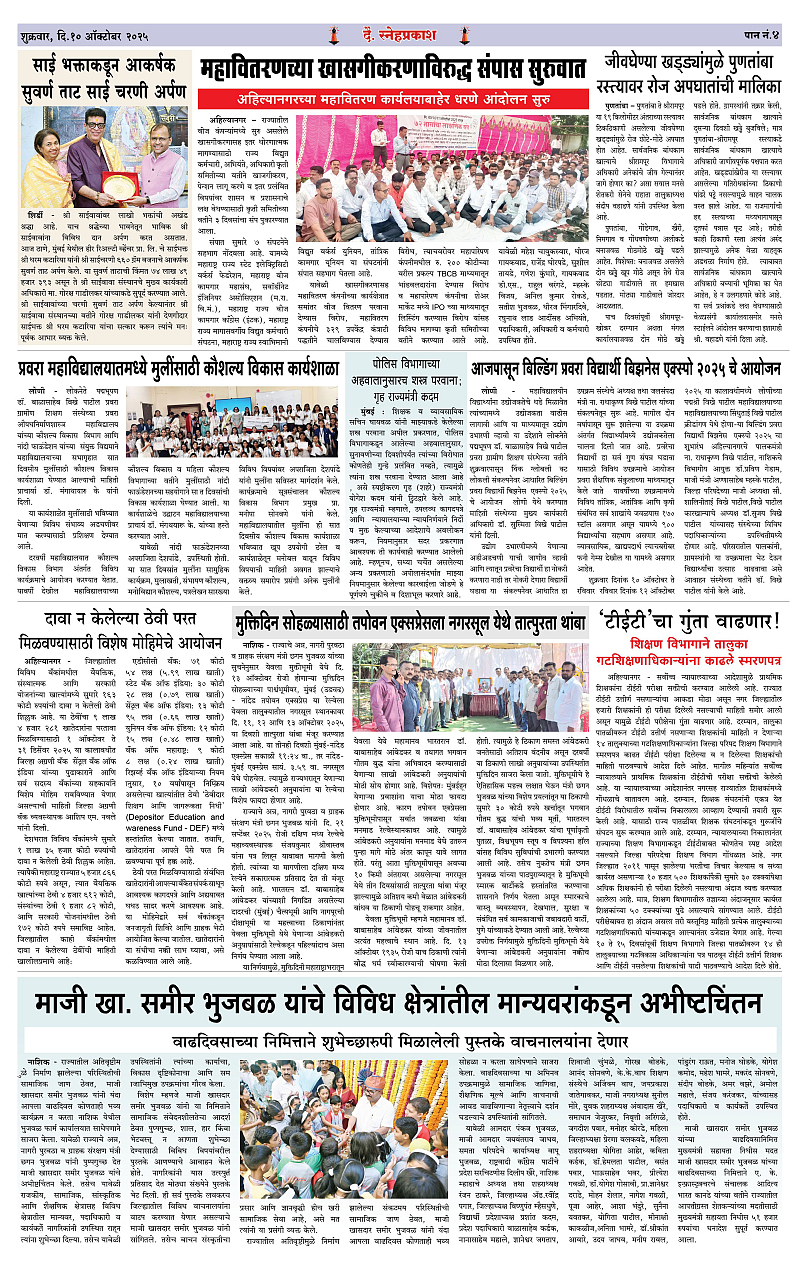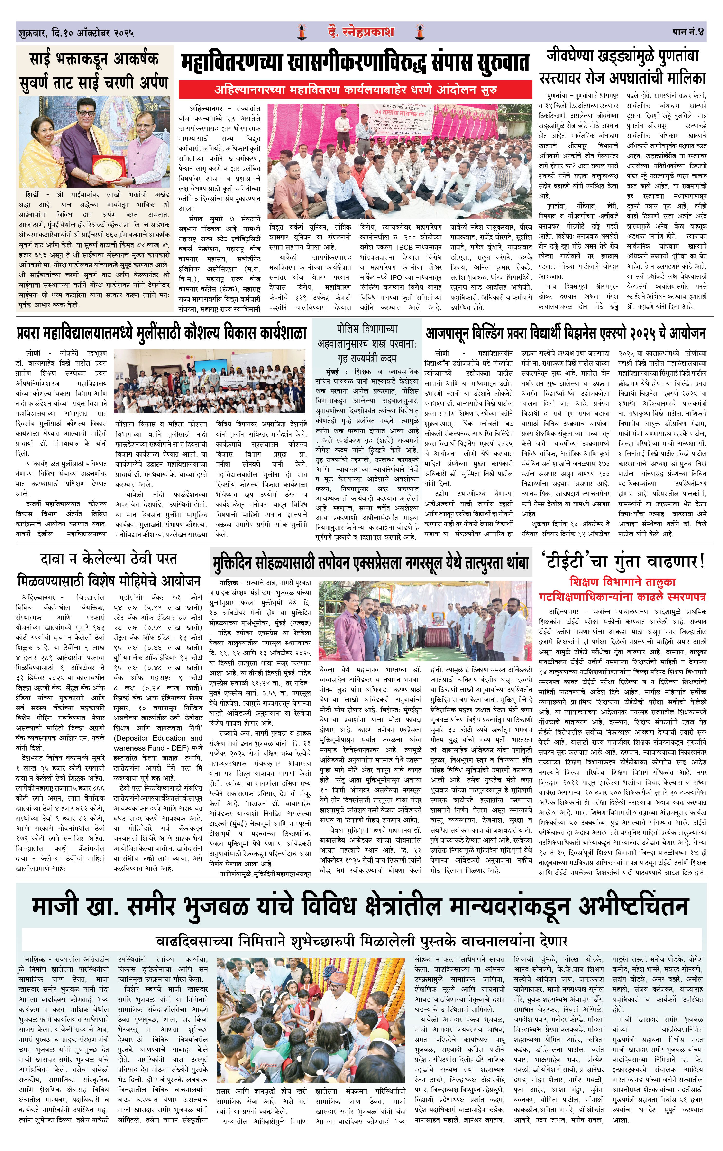 Daily Snehprakash (Marathi) Page: 4 October 10, 2025 Ahilyanagar-Pune-Nashik-shrirampur maharashtra 1 2 3 4 Page 1Page 2Page 3Page 4 × Daily Snehprakash (Marathi) 1-4 colour1-4 colour21-4 colour31-4 colour4 << First << 4 >> Last >> Page no 1Page no 2Page no 3Page no 4