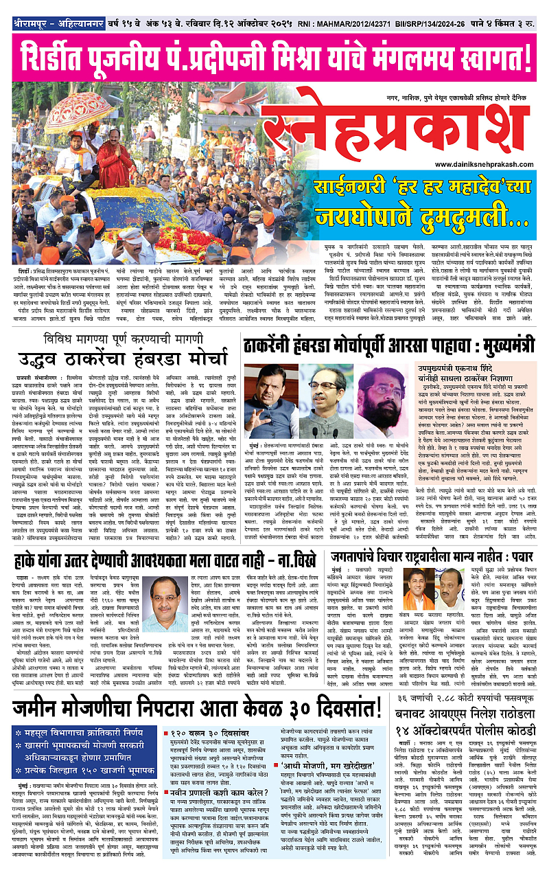 Daily Snehprakash (Marathi) October 12, 2025 Ahilyanagar-Pune-Nashik-shrirampur maharashtra 1 2 3 4 Page 1Page 2Page 3Page 4 × Daily Snehprakash (Marathi) 1-4 colour1-4 colour21-4 colour31-4 colour4 << First << 1 >> Last >> Page no 1Page no 2Page no 3Page no 4