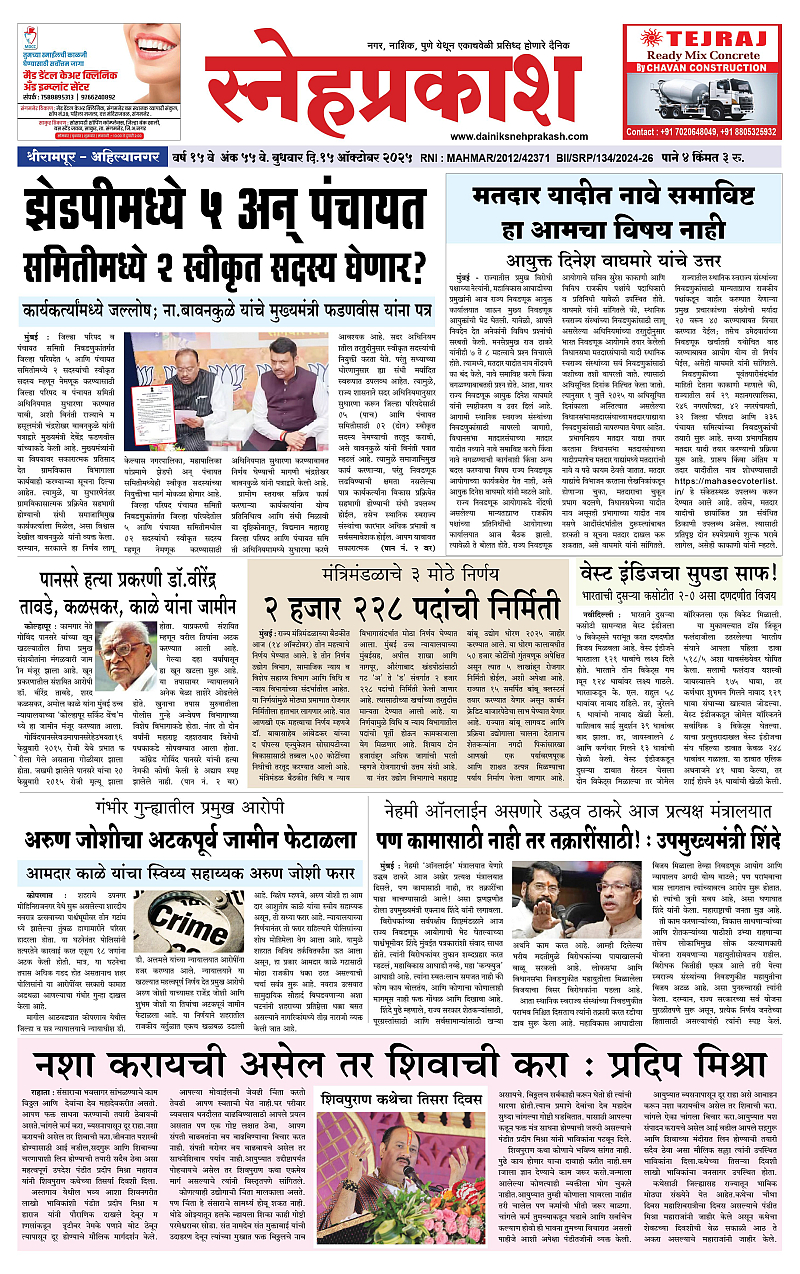 Daily Snehprakash (Marathi) October 15, 2025 Ahilyanagar-Pune-Nashik-shrirampur maharashtra 1 2 3 4 Page 1Page 2Page 3Page 4 × Daily Snehprakash (Marathi) 1-4 colour1-4 colour21-4 colour31-4 colour4 << First << 1 >> Last >> Page no 1Page no 2Page no 3Page no 4