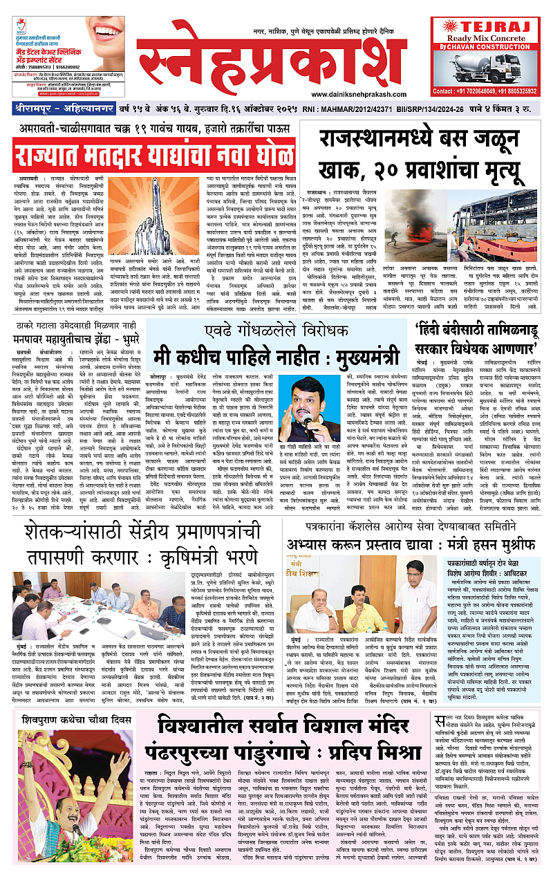 Daily Snehprakash (Marathi) October 16, 2025 Ahilyanagar-Pune-Nashik-shrirampur maharashtra 1 2 3 4 Page 1Page 2Page 3Page 4 × Daily Snehprakash (Marathi) 1-4 colour1-4 colour21-4 colour31-4 colour4 << First << 1 >> Last >> Page no 1Page no 2Page no 3Page no 4