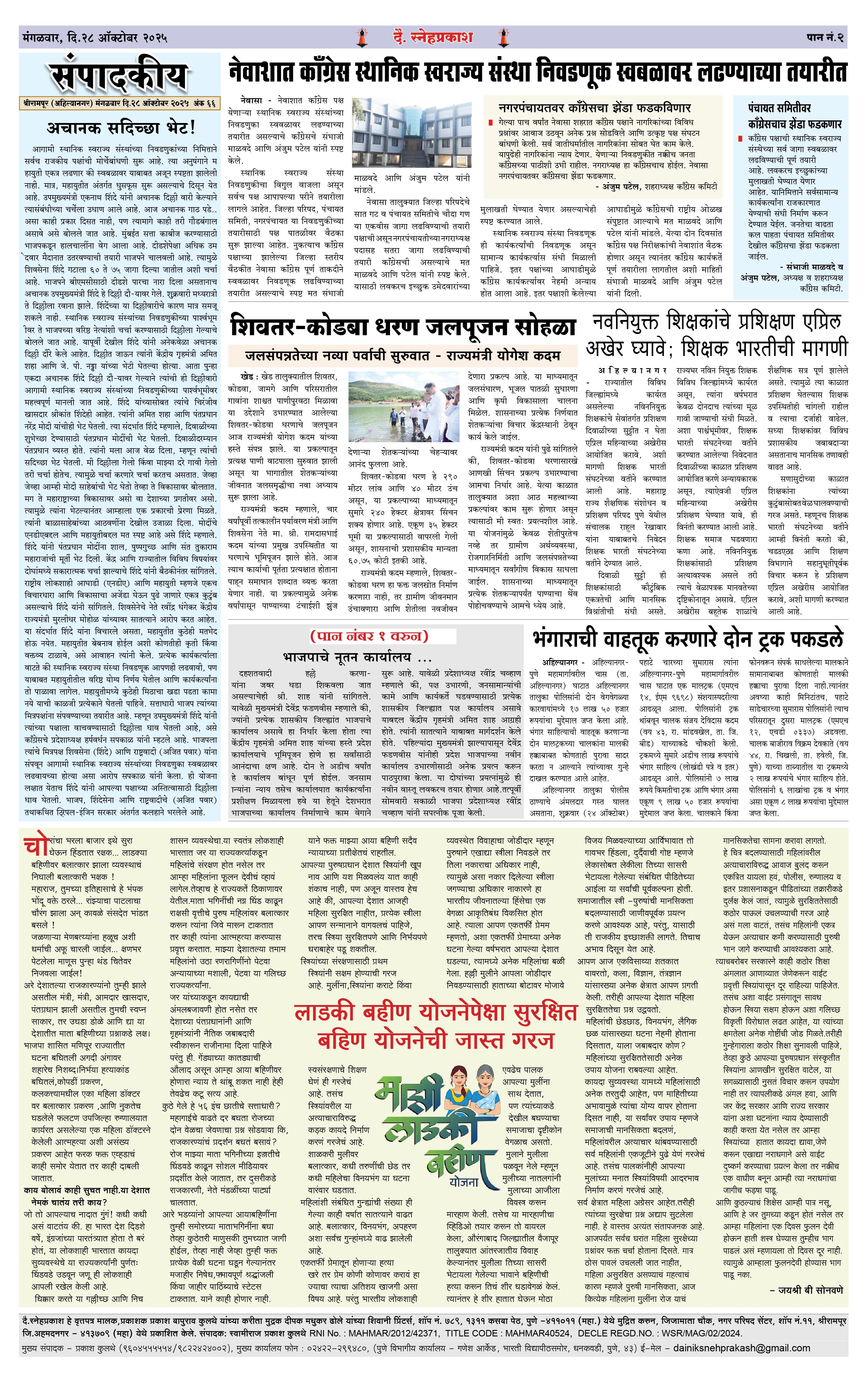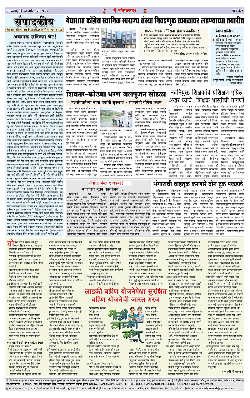 Daily Snehprakash (Marathi) Page: 2 October 28, 2025 Ahilyanagar-Pune-Nashik-shrirampur maharashtra 1 2 3 4 Page 1Page 2Page 3Page 4 × Daily Snehprakash (Marathi) 1-4 colour1-4 colour21-4 colour31-4 colour4 << First << 2 >> Last >> Page no 1Page no 2Page no 3Page no 4