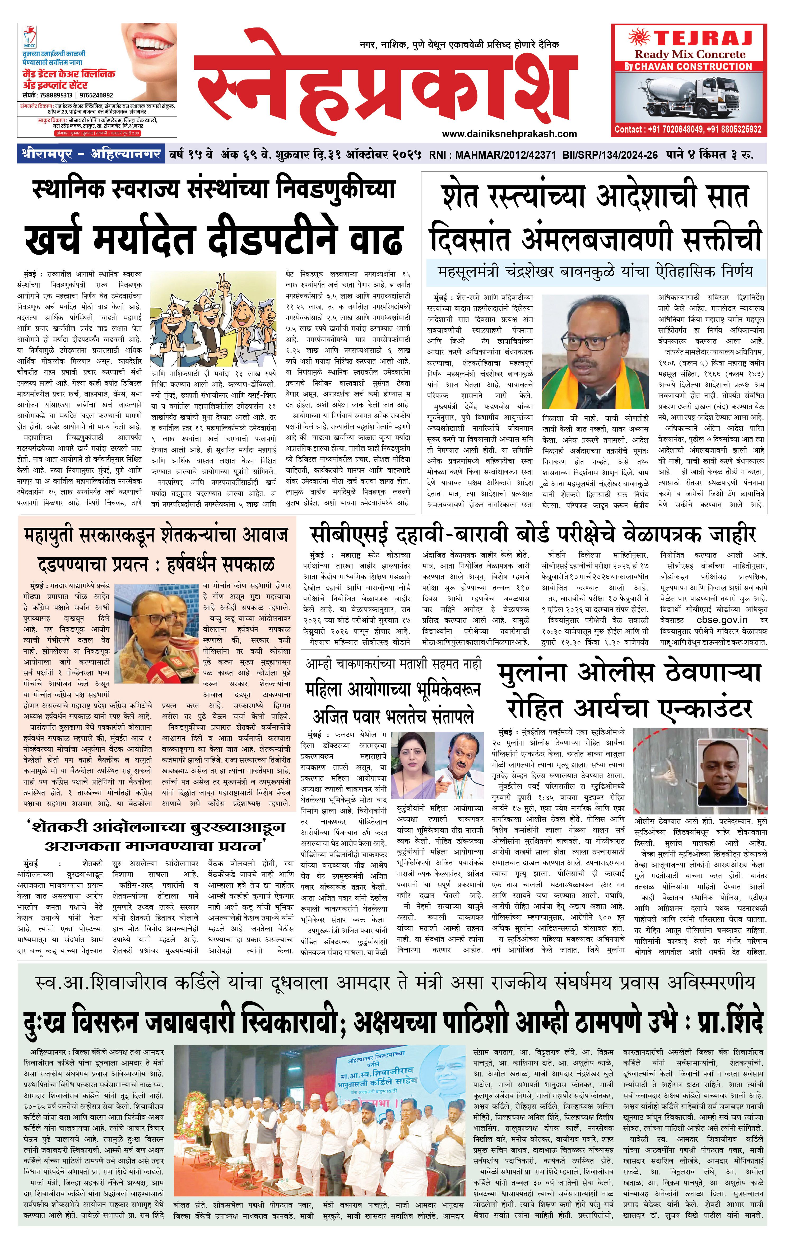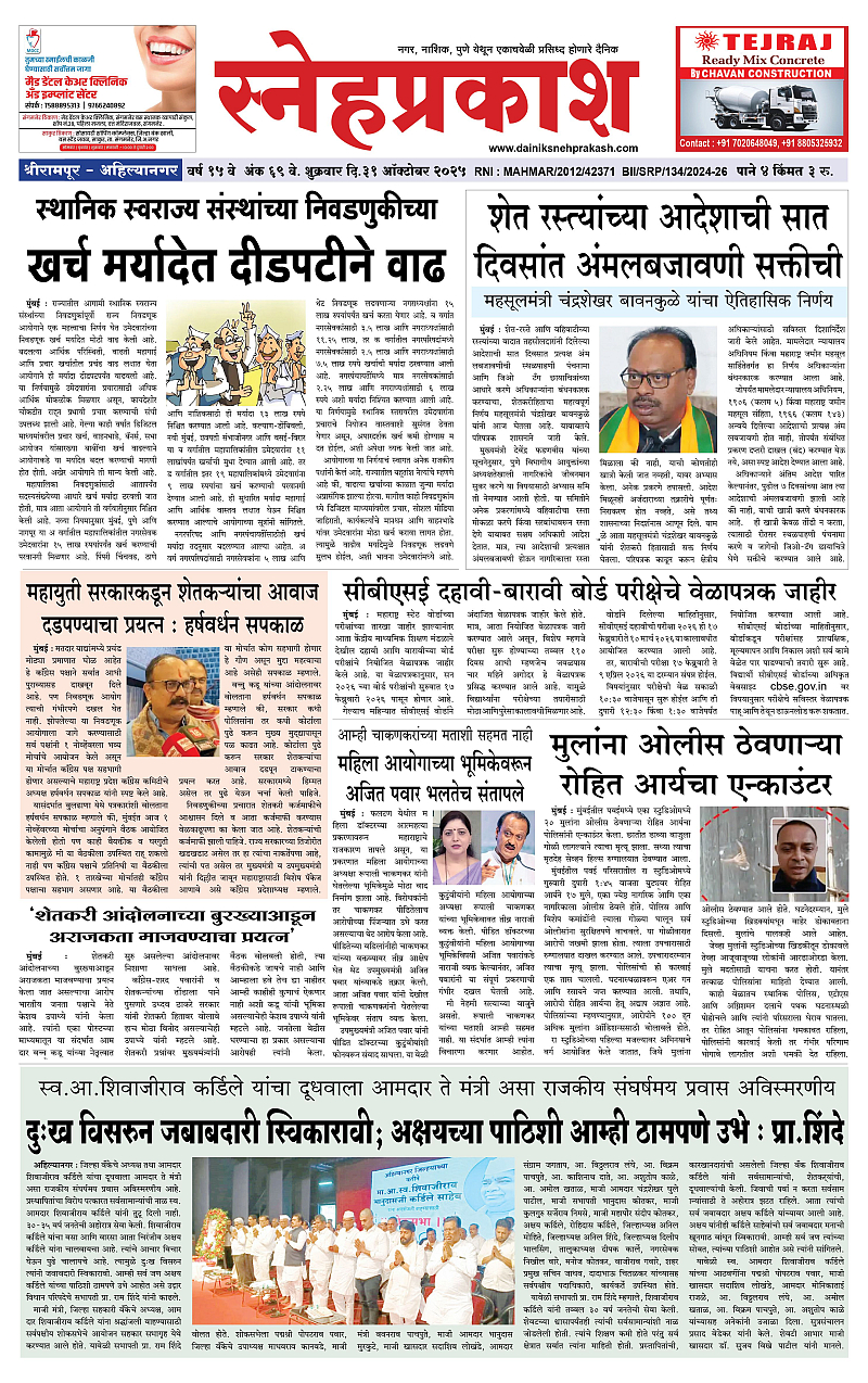 Daily Snehprakash (Marathi) October 31, 2025 Ahilyanagar-Pune-Nashik-shrirampur maharashtra 1 2 3 4 Page 1Page 2Page 3Page 4 × Daily Snehprakash (Marathi) 1-4 colour1-4 colour21-4 colour31-4 colour4 << First << 1 >> Last >> Page no 1Page no 2Page no 3Page no 4
