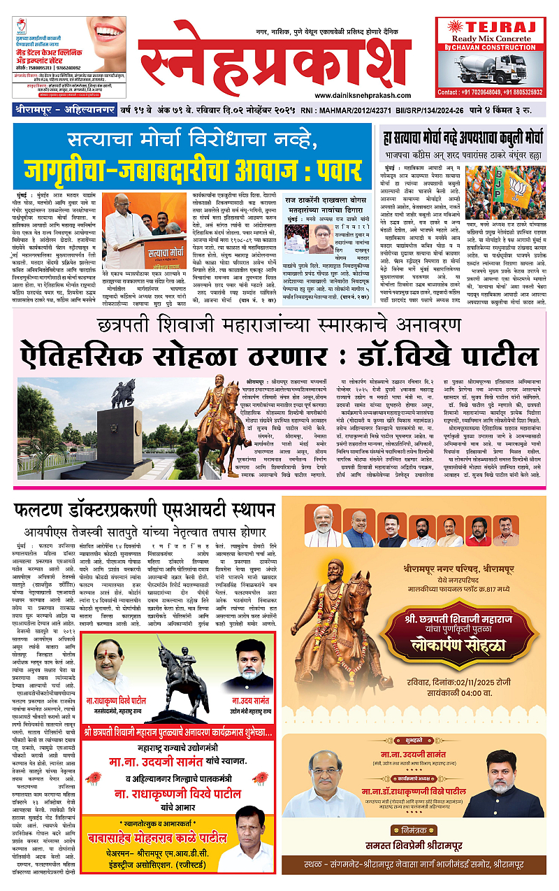 Daily Snehprakash (Marathi) November 02, 2025 Ahilyanagar-Pune-Nashik-shrirampur maharashtra 1 2 3 4 Page 1Page 2Page 3Page 4 × Daily Snehprakash (Marathi) 1-41-421-431-44 << First << 1 >> Last >> Page no 1Page no 2Page no 3Page no 4