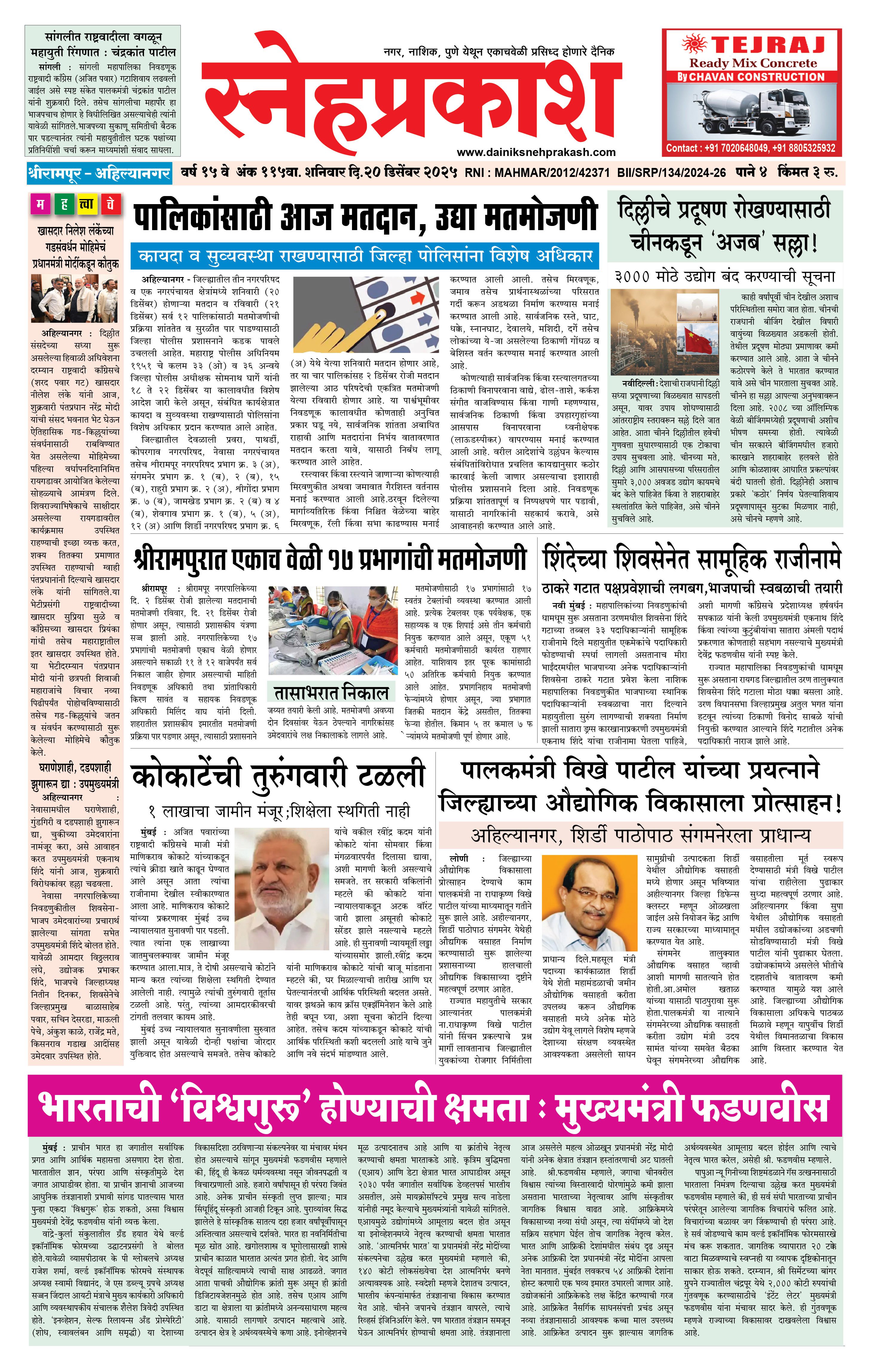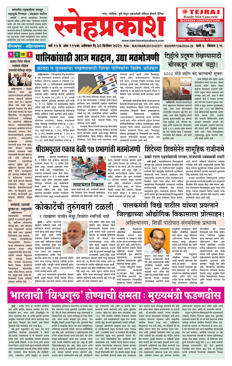 Daily Snehprakash (Marathi) December 20, 2025 Ahilyanagar-Pune-Nashik-shrirampur maharashtra 1 2 3 4 Page 1Page 2Page 3Page 4 × Daily Snehprakash (Marathi) 1-4 c1-4 c21-4 c31-4 c4 << First << 1 >> Last >> Page no 1Page no 2Page no 3Page no 4