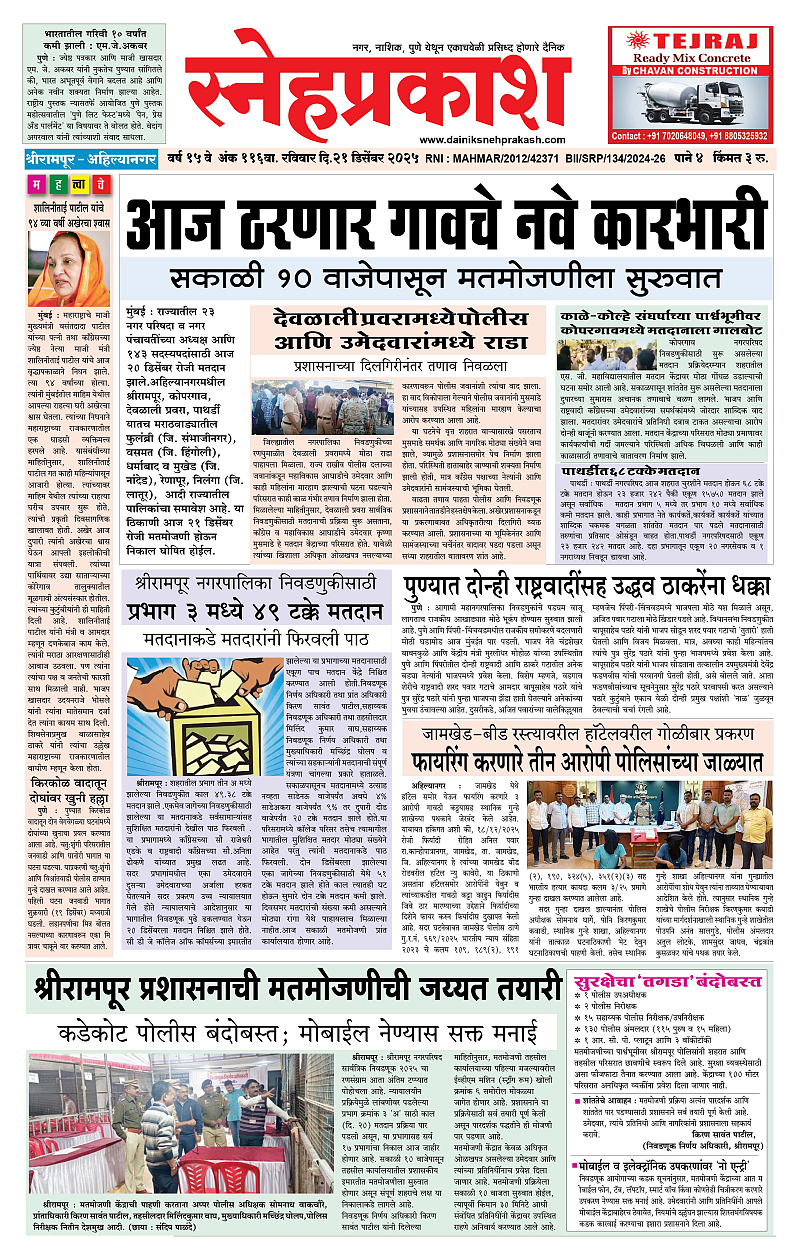 Daily Snehprakash (Marathi) December 21, 2025 Ahilyanagar-Pune-Nashik-shrirampur maharashtra 1 2 3 4 Page 1Page 2Page 3Page 4 × Daily Snehprakash (Marathi) 1-4 c1-4 c21-4 c31-4 c4 << First << 1 >> Last >> Page no 1Page no 2Page no 3Page no 4
