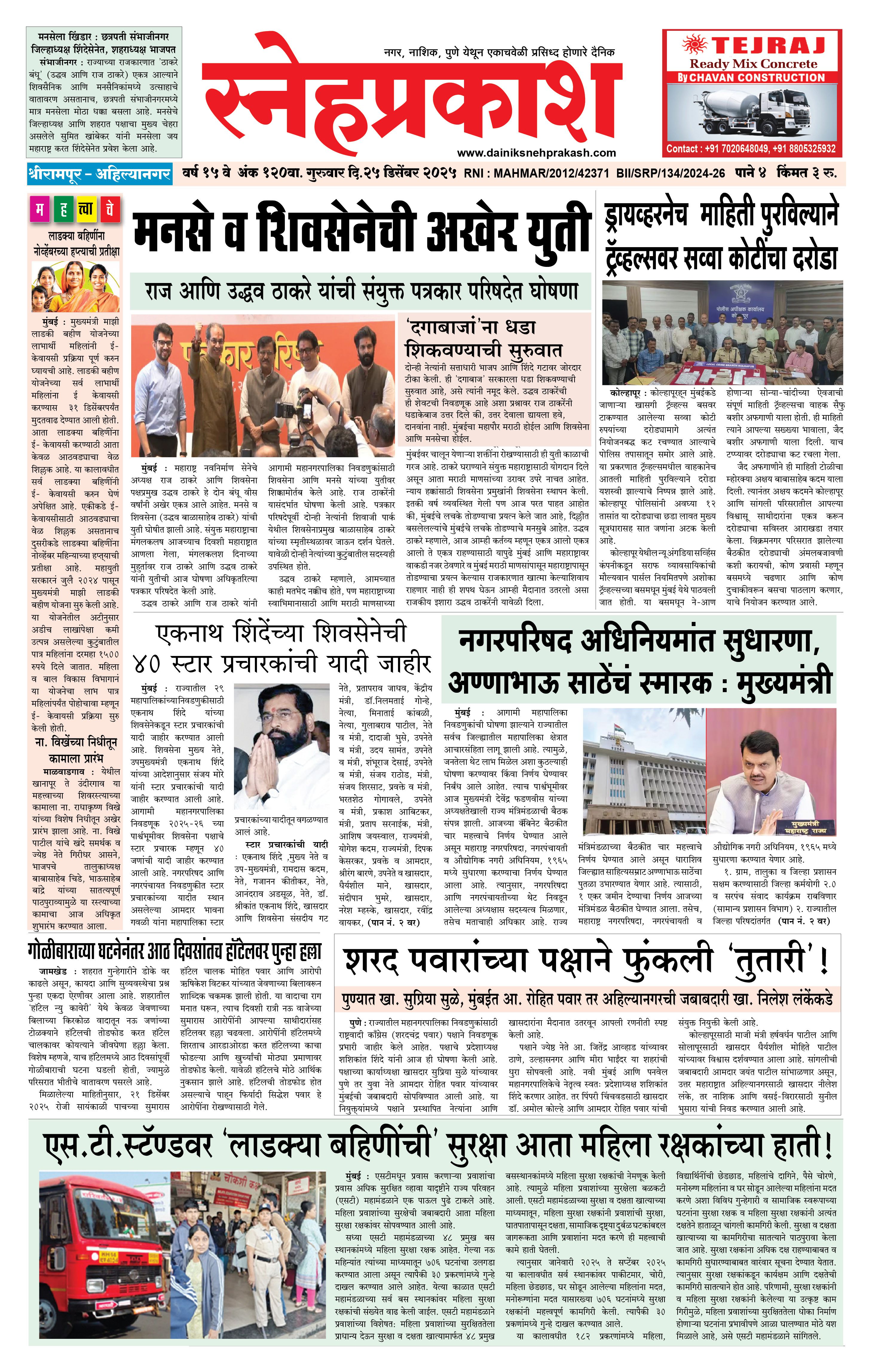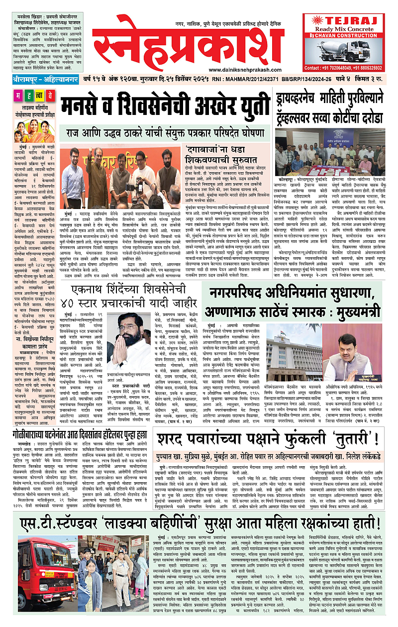 Daily Snehprakash (Marathi) December 25, 2025 Ahilyanagar-Pune-Nashik-shrirampur maharashtra 1 2 3 4 Page 1Page 2Page 3Page 4 × Daily Snehprakash (Marathi) 4424344 << First << 1 >> Last >> Page no 1Page no 2Page no 3Page no 4