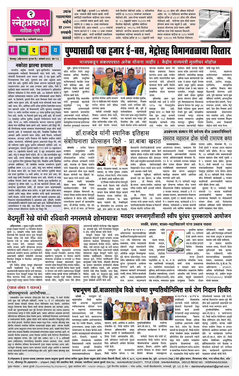 Daily Snehprakash (Marathi) Page: 2 January 08, 2026 ahilyanagar-pune-nashik-shrirampur-maharashtra 1 2 3 4 Page 1Page 2Page 3Page 4 × Daily Snehprakash (Marathi) 1-41-421-431-44 << First << 2 >> Last >> Page no 1Page no 2Page no 3Page no 4