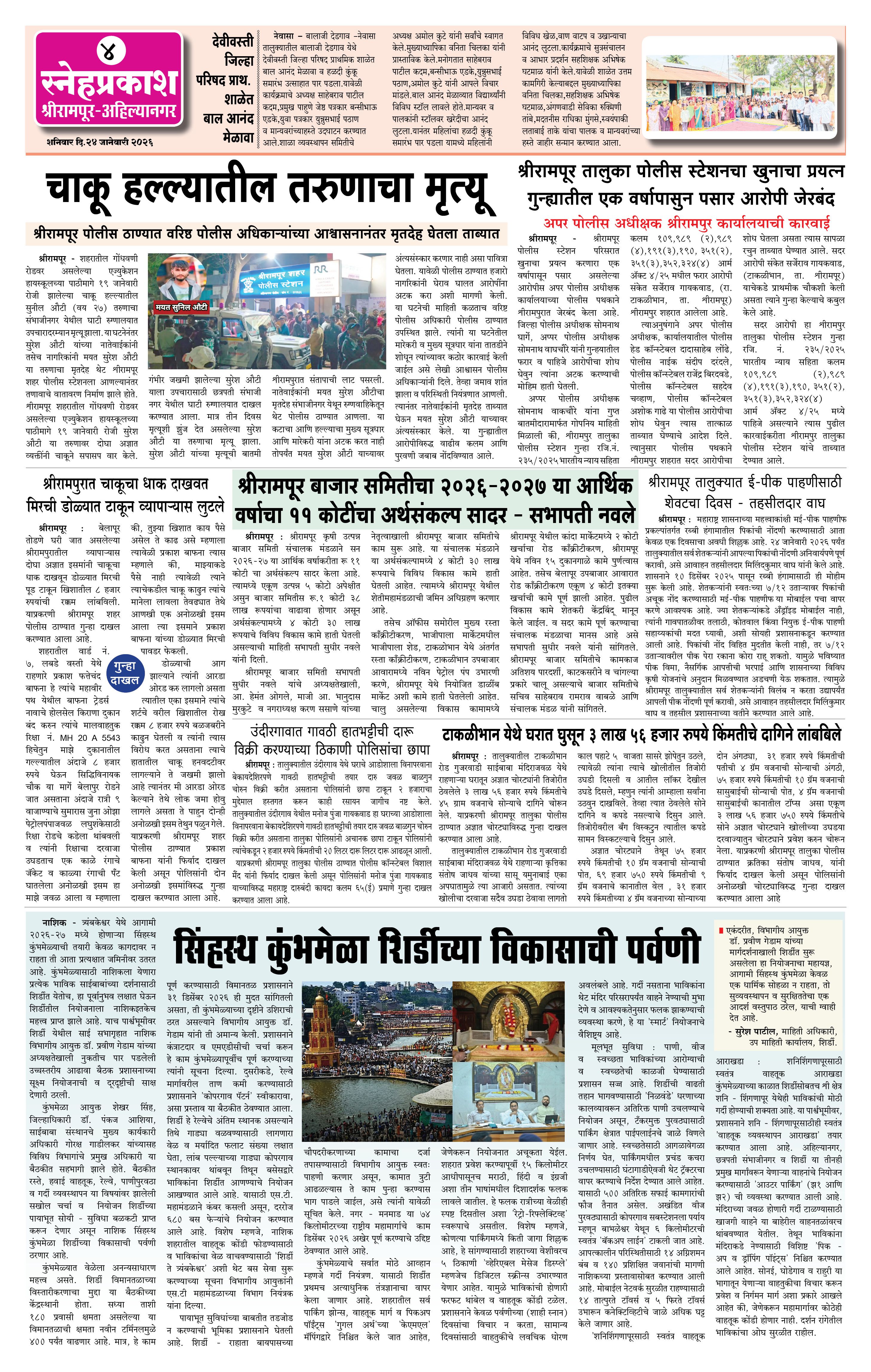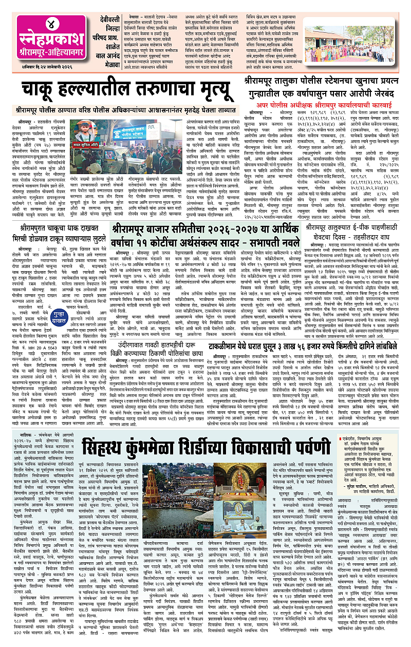 Daily Snehprakash (Marathi) Page: 4 January 24, 2026 Ahilyanagar-Pune-Nashik-shrirampur maharashtra 1 2 3 4 Page 1Page 2Page 3Page 4 × Daily Snehprakash (Marathi) 1121314 << First << 4 >> Last >> Page no 1Page no 2Page no 3Page no 4
