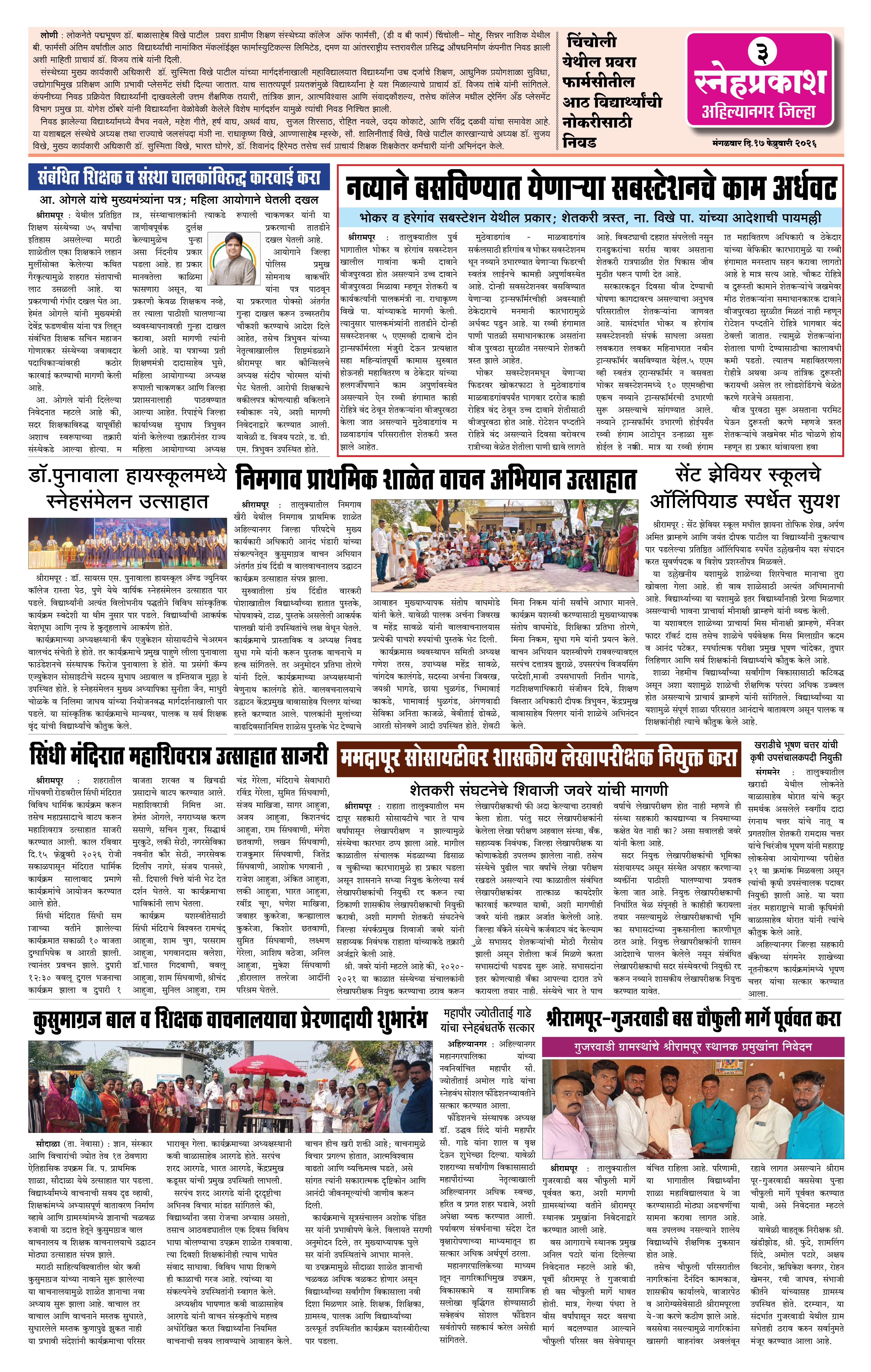 Daily Snehprakash (Marathi) Page: 3 February 17, 2026 Ahilyanagar-Pune-Nashik-shrirampur maharashtra 1 2 3 4 Page 1Page 2Page 3Page 4 × Daily Snehprakash (Marathi) 122223 << First << 3 >> Last >> Page no 1Page no 2Page no 3Page no 4