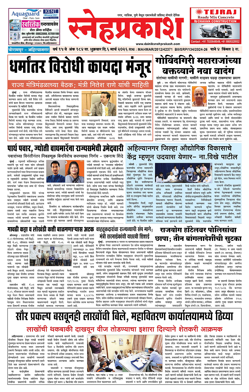 Daily Snehprakash (Marathi) March 06, 2026 Ahilyanagar-Pune-Nashik-shrirampur maharashtra 1 2 3 4 Page 1Page 2Page 3Page 4 × Daily Snehprakash (Marathi) 1-41-421-431-44 << First << 1 >> Last >> Page no 1Page no 2Page no 3Page no 4