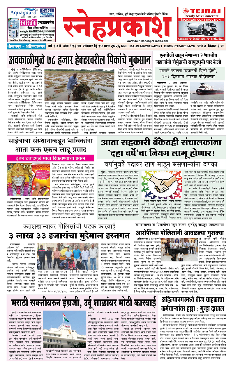 Daily Snehprakash (Marathi) March 15, 2026 Ahilyanagar-Pune-Nashik-shrirampur maharashtra 1 2 3 4 Page 1Page 2Page 3Page 4 × Daily Snehprakash (Marathi) 1-41-421-431-44 << First << 1 >> Last >> Page no 1Page no 2Page no 3Page no 4