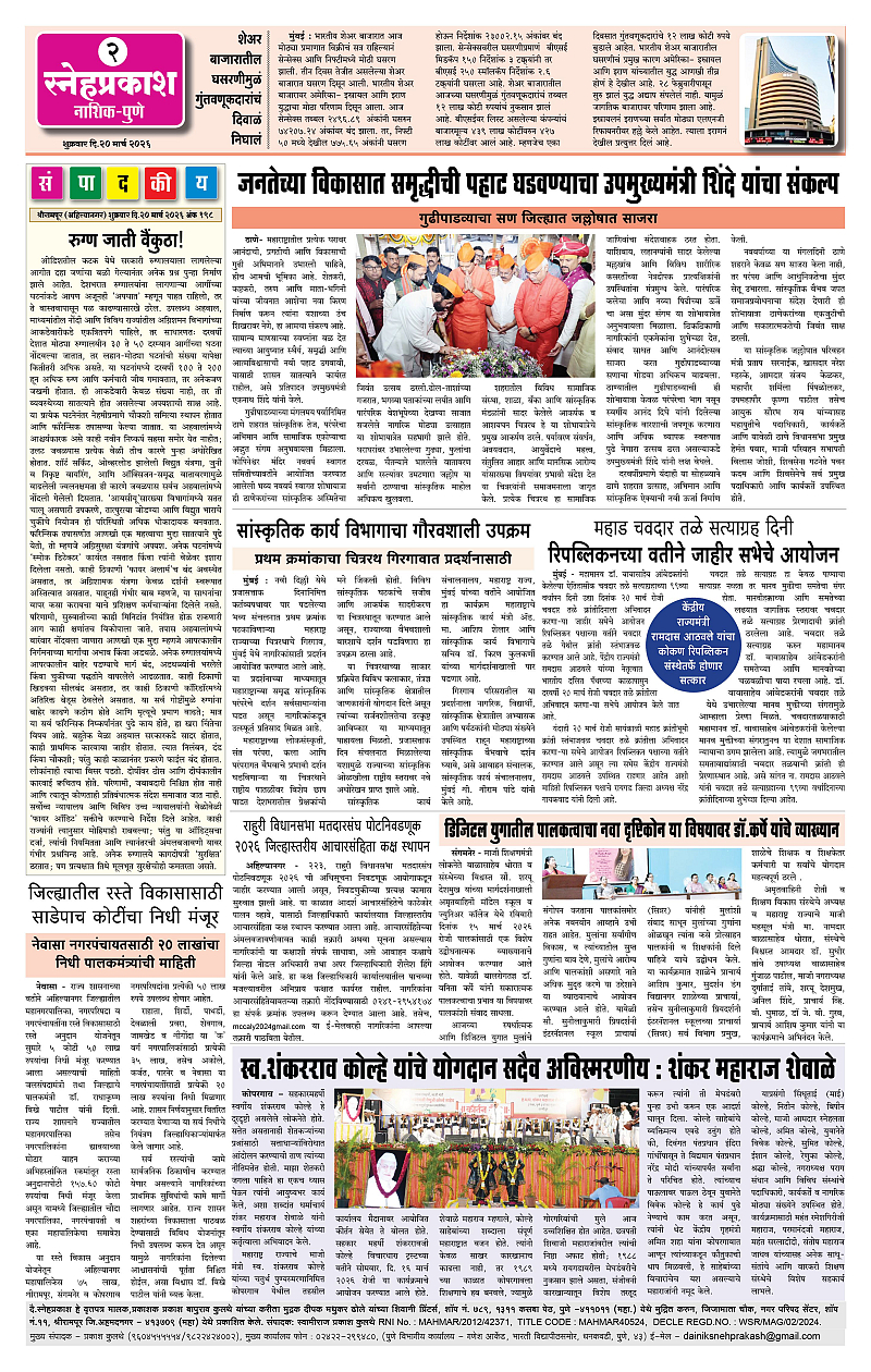 Daily Snehprakash (Marathi) Page: 2 March 20, 2026 Ahilyanagar-Pune-Nashik-shrirampur maharashtra 1 2 3 4 Page 1Page 2Page 3Page 4 × Daily Snehprakash (Marathi) 1-41-423-31-44 << First << 2 >> Last >> Page no 1Page no 2Page no 3Page no 4