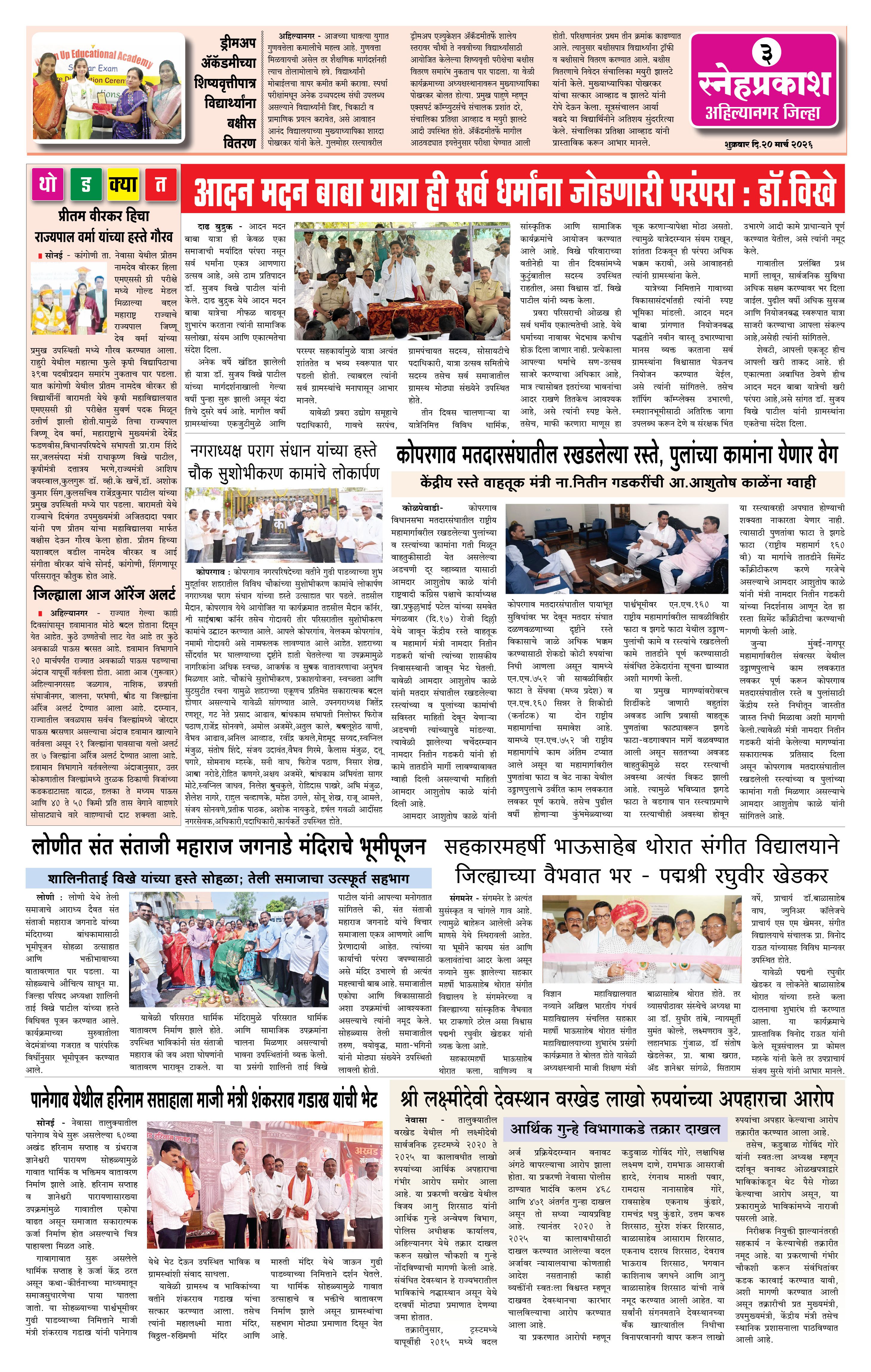 Daily Snehprakash (Marathi) Page: 3 March 20, 2026 Ahilyanagar-Pune-Nashik-shrirampur maharashtra 1 2 3 4 Page 1Page 2Page 3Page 4 × Daily Snehprakash (Marathi) 1-41-423-31-44 << First << 3 >> Last >> Page no 1Page no 2Page no 3Page no 4